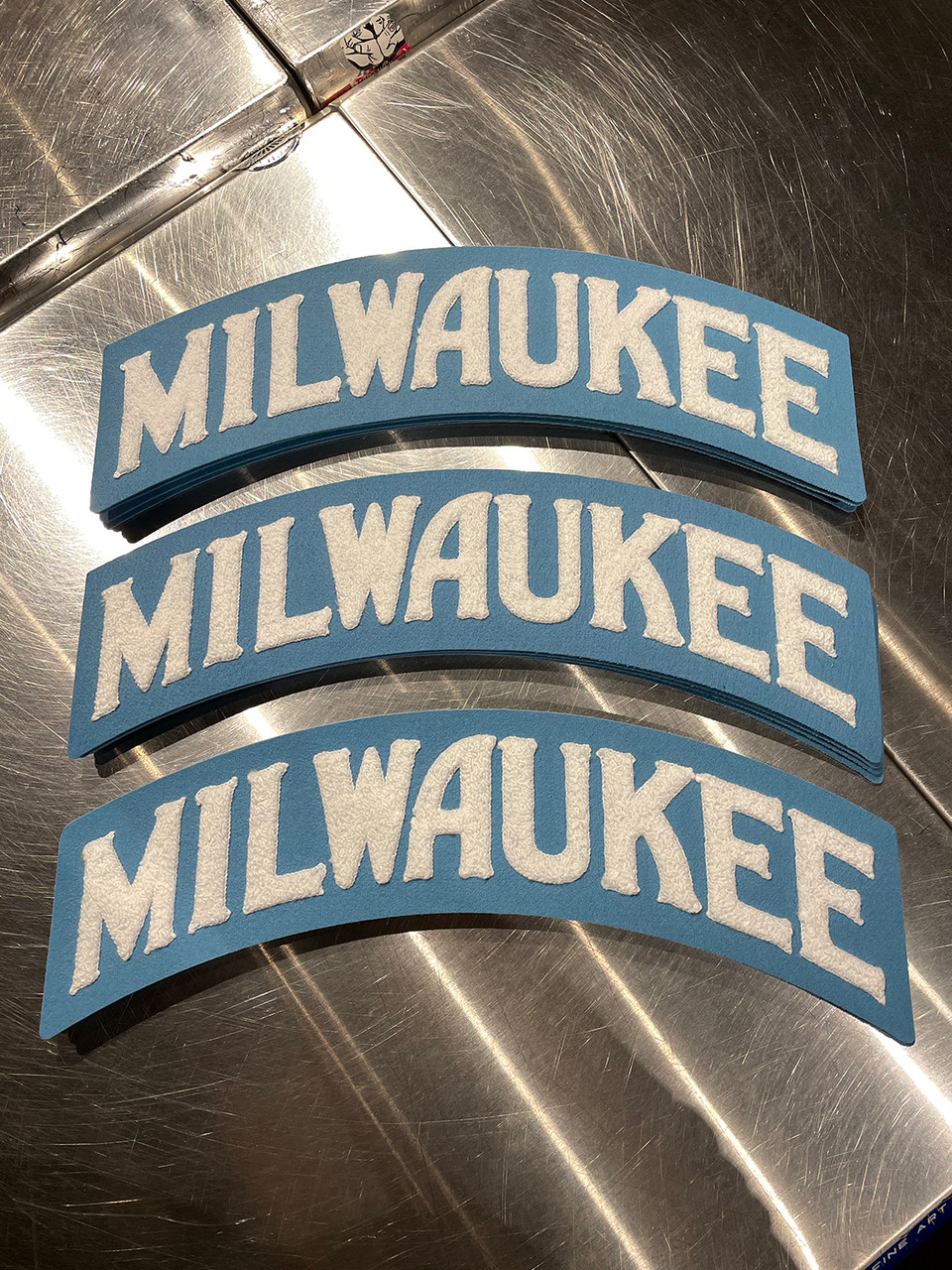 The Milwaukee Arch 100% wool patch is W 14" x H 5.5" White and sky blue. Embroidered white chenille wool on sky blue felt. Apply to your favorite hoodie or jacket.